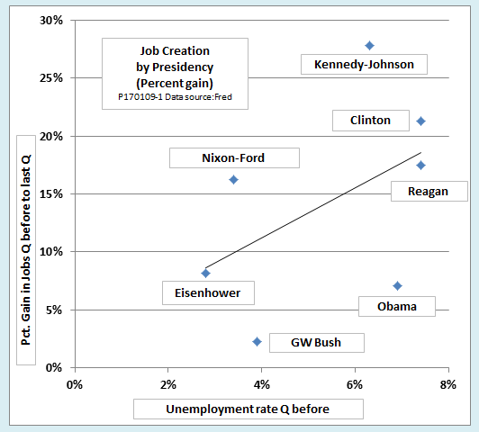in jobs over eight-year presidencies against the unemployment rate in the