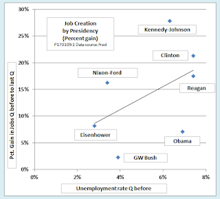 - We should take the state of the economy into account. Other things being equal, a presidency that starts in a slump and ends in a boom is going to find it a lot easier to create jobs than one that starts at full employment or in an unsustainable boom.