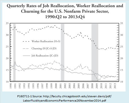 A paper by Stephen J. Davis of the University of Chicago and John Haltiwanger of the University of Maryland  charts the decline in US labor market fluidity. Using data on quits, layoffs, and job openings from the Bureau of Labor Statistics, supplemented by other data sources, the authors construct three fluidity indicators: