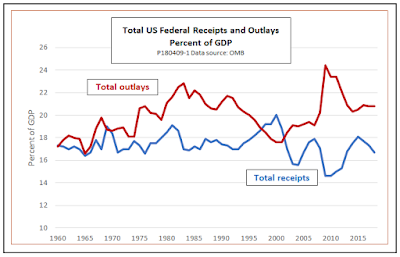 To see why a balanced budget amendment would undermine stability, we need to understand how the budget affects the business cycle, and how the business cycle affects the budget. When we look at the pattern of federal receipts and outlays over time, as shown in the following chart, we see a lot of ups and downs. Where do they come from?