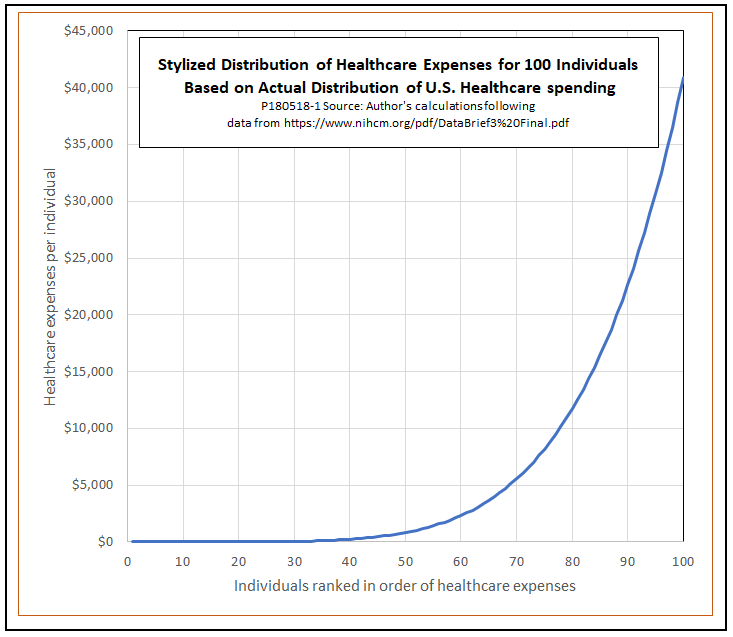 However, copays also have their drawbacks. One is that for a given out-of-pocket maximum, a UCC plan with copays would be more expensive for the government to operate. To see why, suppose that our Plans A and B were applied to 100 individuals, whose health care spending was distributed according to the pattern shown in the following chart. As in the actual distribution of health care expenses for the U.S. population, this stylized distribution of spending is highly skewed. The average is $10,000 per person, but a third of the population spend less than $100 each, while the top 20 percent of individuals account for more than 80 percent of the total.