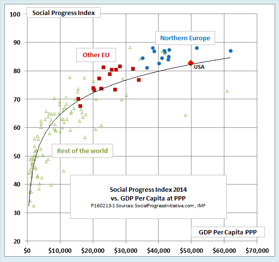 Here is a chart that gives the big picture. The horizontal axis shows GDP per capita. (GDP here is measured at purchasing power parity (PPP) to remove distortions caused by over- or undervalued exchange rates.) The vertical axis shows a measure of human wellbeing called the Social Progress Index (SPI). Unlike some other broad indexes of human welfare, the SPI does not explicitly include income, wealth, or GDP. Instead, it regards them as “inputs” that support the production of “outputs” like health, security, and personal freedoms. >>>Read more
