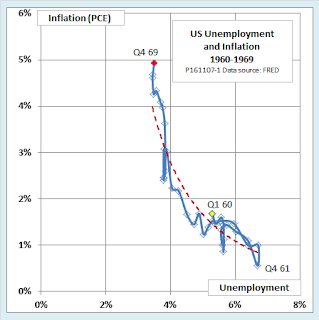 Back in the 1960s, things seemed simpler. Consider the following chart, which shows the pattern of unemployment and inflation that prevailed during the Kennedy-Johnson years, 1960-1969: