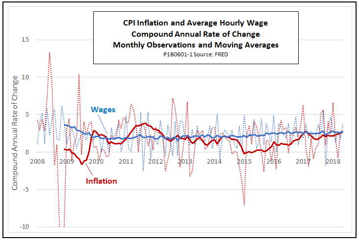 The trends of the moving averages contain both not-so-good news and better news. For workers, the news is not so good, inasmuch as the wage gains for May, which are hopeful taken in isolation, may turn out to be a statistical fluke. From a macroeconomic point of view, however, the news is better. With CPI and wage trends still holding at or close to 2.5 percent, there is little sign of overheating yet.
